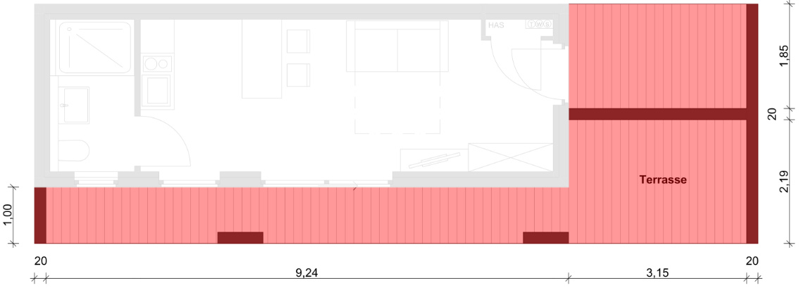 Wohnen/Kochen: 19,2 qm Bad: 4,1 qm